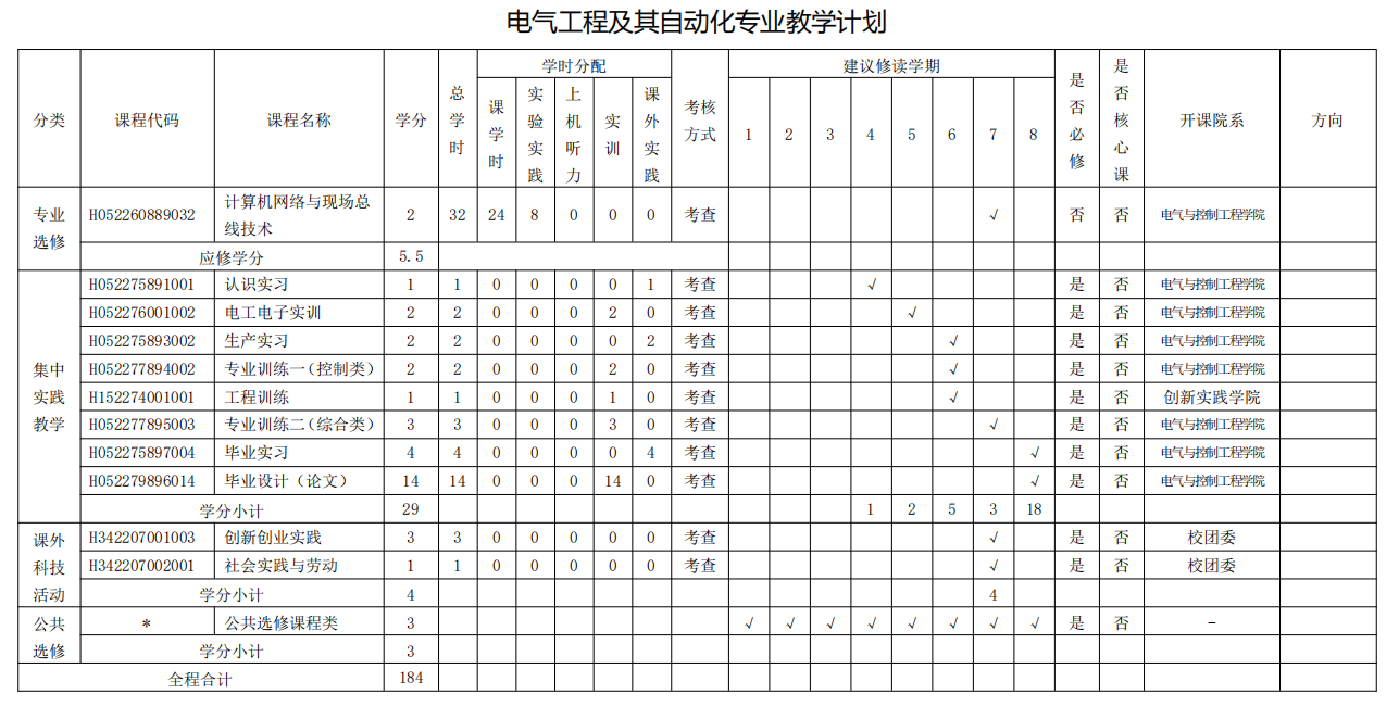 包括认识实习、电工电子实训、工程训练、生产实习、专业训练一(控制类)、专业训练二(综合类)、毕业实习、毕业设计等。