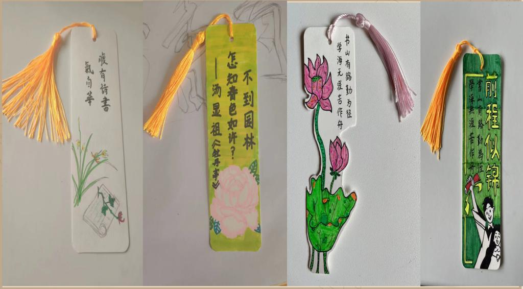 DIY社团社长王冬瑾带领杨玉洁、郭俣彤等同学向我们分享了书签的制作过程和一些细节。折出书签的轮廓。首先选择一张正方形的纸,顶角对折,形成一个十字星形,然后任意一个顶角像中心折,形成一个三角形,然后内向外平行折3次。折出书签的细节。然后展开,在内外折,跟折扇面一样,平行对边相同操作,捏住两个扇面的边,向内对折,展开再向外对折,中间压平,下方边向对边重点翻折。在制作完书签后,王东瑾同学解释了自己制作的书签所具有的含义。‘不到圆林,怎知春色如许’的意思是不到这牡丹亭的花园中,怎会知道这有如此迷人的风光呢?我们所读的书不也是一样吗,如果没有仔细体味书中的一字一句,又怎会领略书中的精彩之处呢?