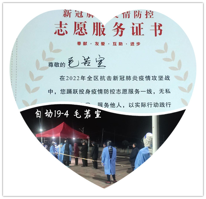 回想起当志愿者的第一天,在防疫人员的指导下,我穿上红马甲、套上防护服,在防疫检测点认真值守,提醒居民扫描二维码,填写核酸检测信息,确定人员信息,维持队伍秩序,监督安全距离,安抚居民情绪,虽然这次志愿活动充满了挑战和劳累,但却给了我最好的锻炼机会和实践舞台,收获了许多温暖。每一句大家相互的慰问,每一次行人们的努力配合,都给工作中的我带来了极大的幸福和满足,我认为我的工作也是神圣而有意义的!