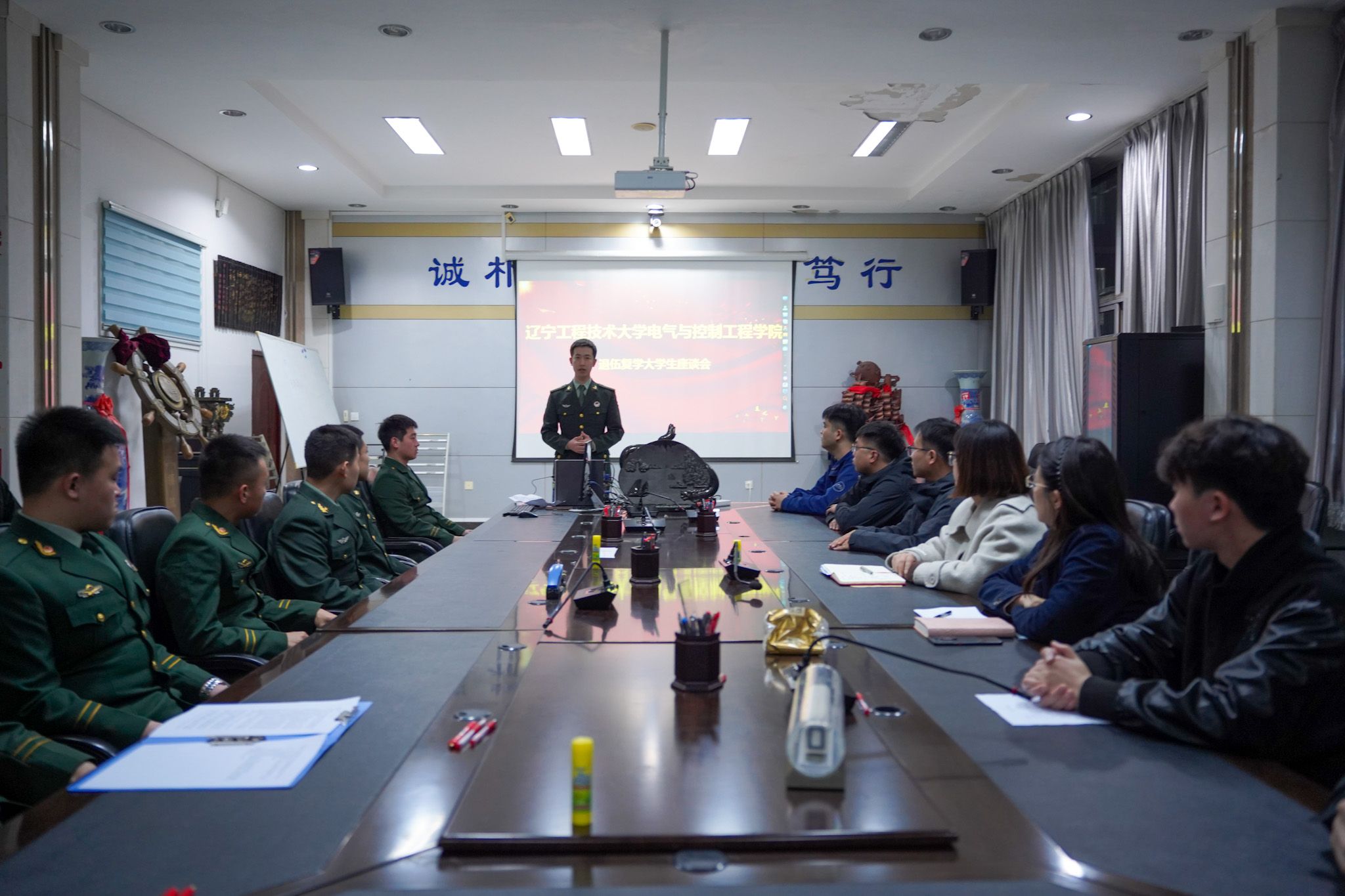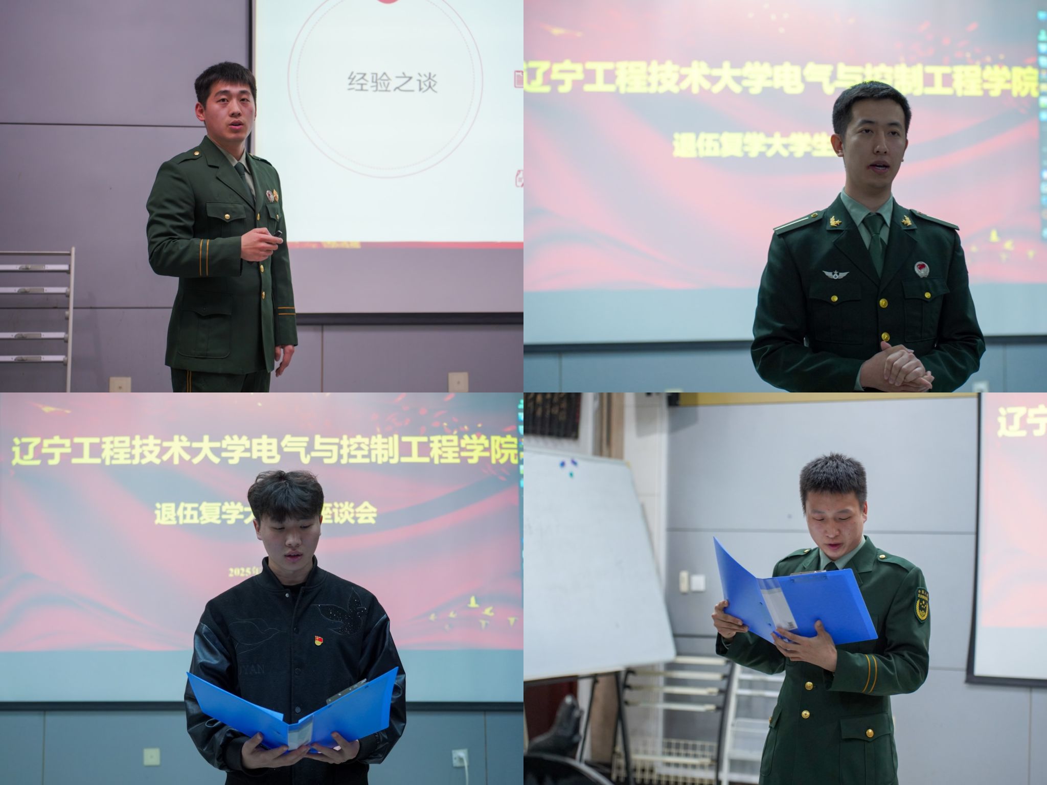会议伊始,退伍复学大学生代表张继正、蔡新宇分享他们复学后的考研经验与求职经历,鼓励战友们保持军人作风,勇敢追逐目标,展现了他们“退伍不褪色、退役不退志”的榜样力量。