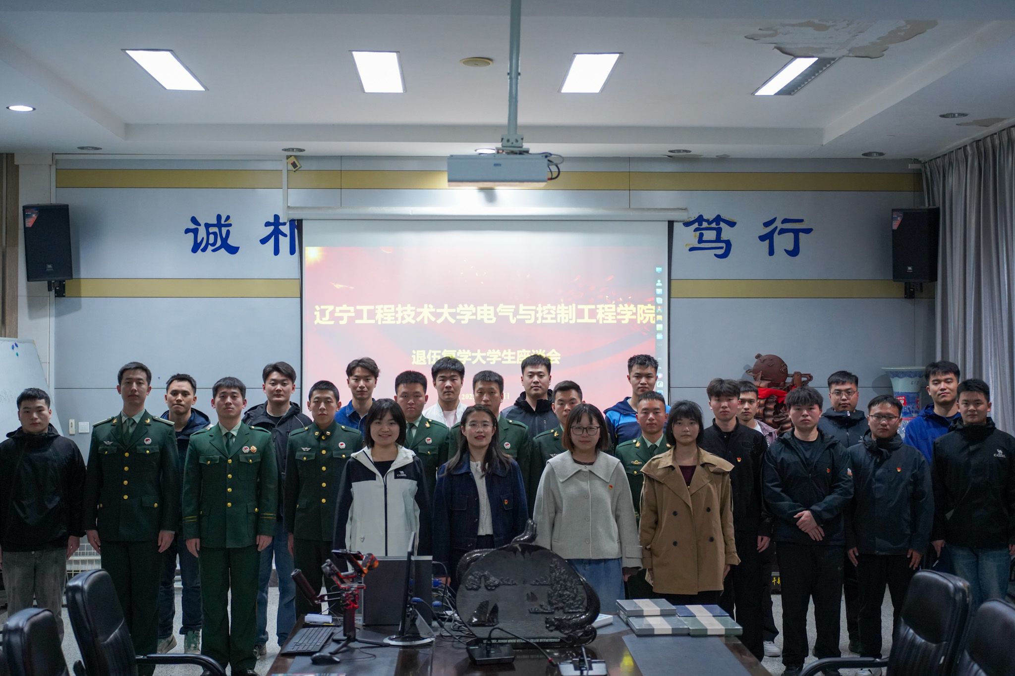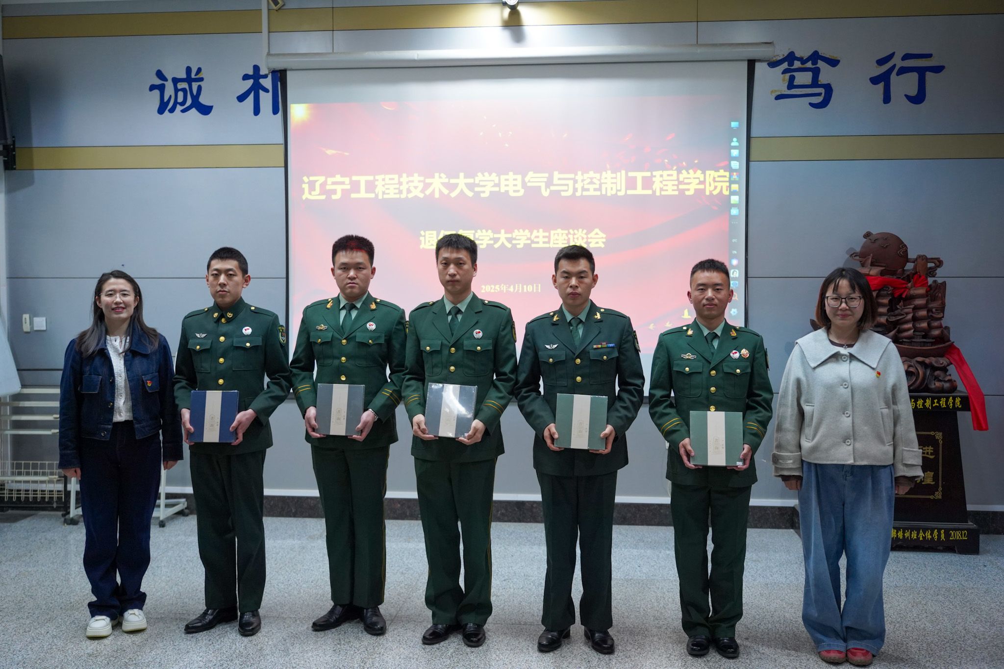 教师为退伍复学大学生颁发学习用品,全体参会人员合影留念。
