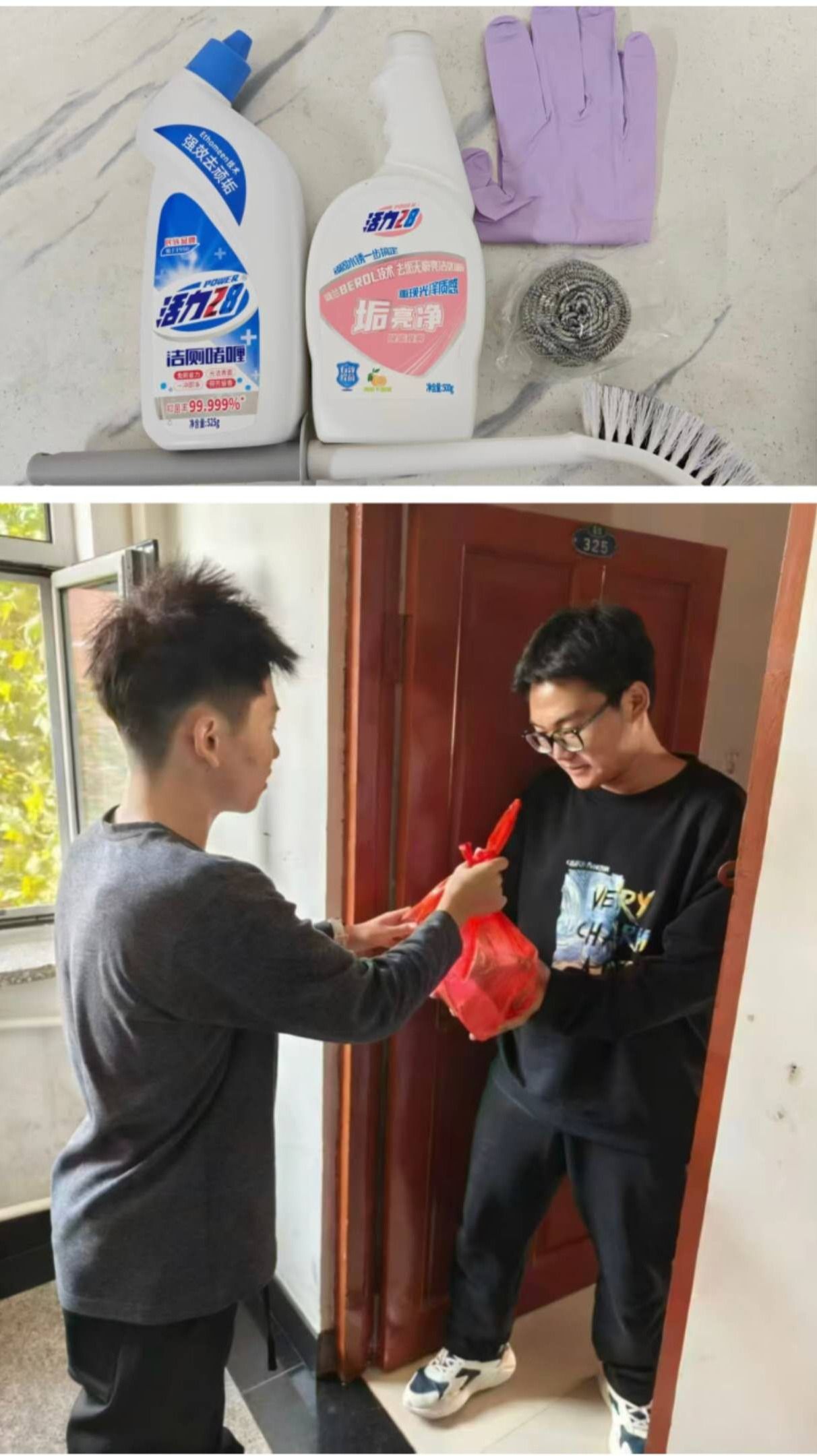 为570间寝室统一采购了包含洁厕灵、垢污净、马桶刷、钢丝球和手套在内的“清洁五件套”,并由U体育