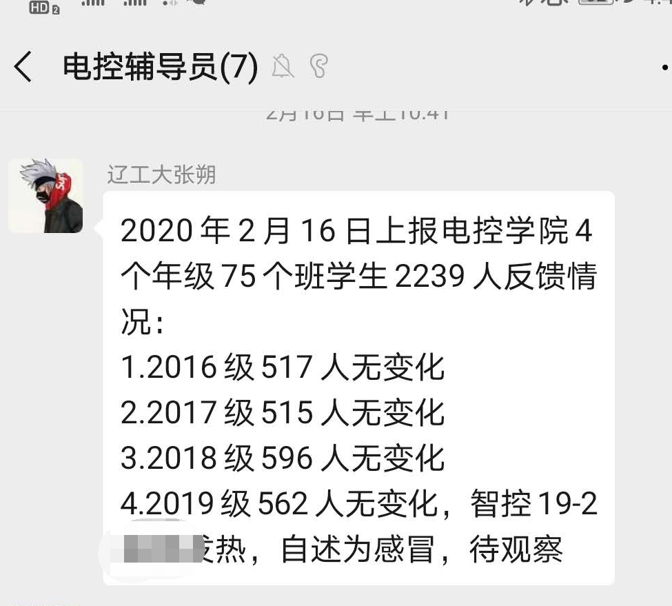 安排辅导员和班导师在第一时间有针对性地排查湖北籍学生及与湖北籍人员有接触史的学生,统计学生去向、身体健康状况及家庭情况,做好对学生及家长的通知和解释工作,建立湖北籍学生QQ群、湖北籍学生党支部帮扶群等实时与这些学生保持密切联系。此外,对于每日出现身体不适的学生进行日日更新上报,全程跟踪直至痊愈。
