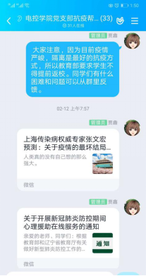 团委开展线上主题团日活动。号召学生干部不忘肩上重任,积极配合老师完成疫情防控宣传工作,充分利用信息媒介开展学生工作。