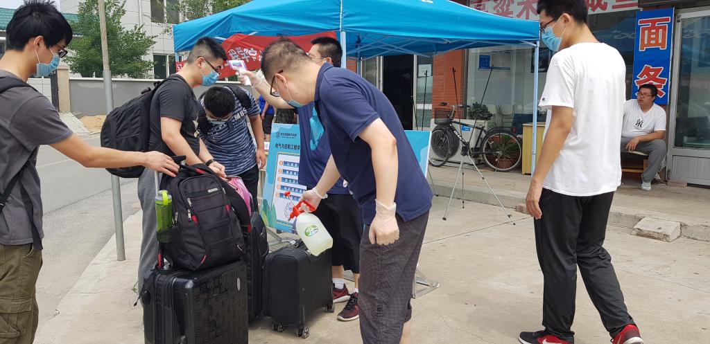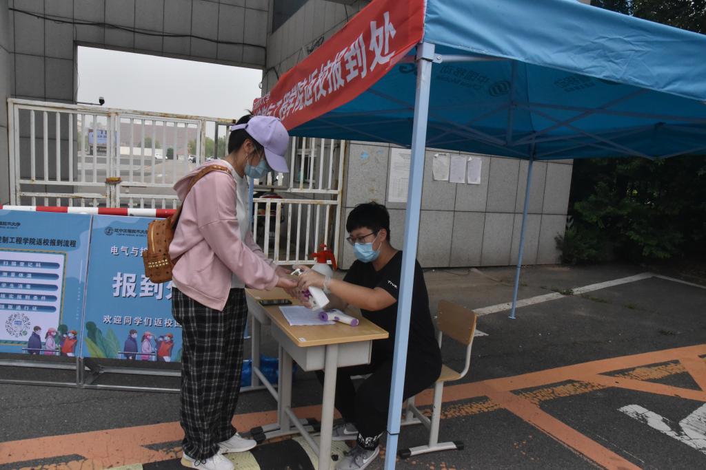 在报到现场,返校学生在工作人员引导下,扫码、登记、测量体温、对手部和行李进行消毒、核实报到条件、发放通行证,完成报到流程。U体育