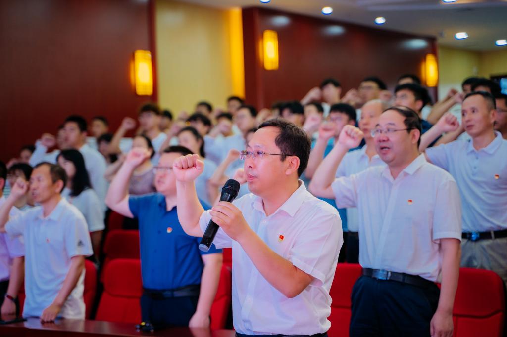 党委书记田国胜的带领下,面向鲜红的中国共产党党旗,举起右拳,重温入党誓词。