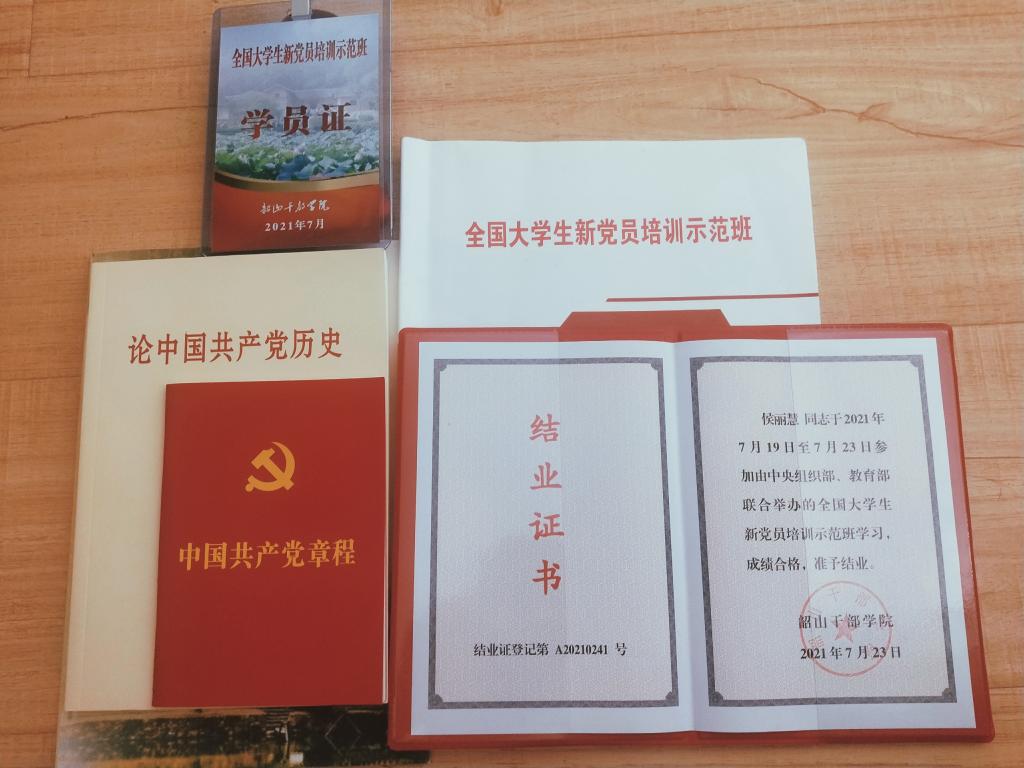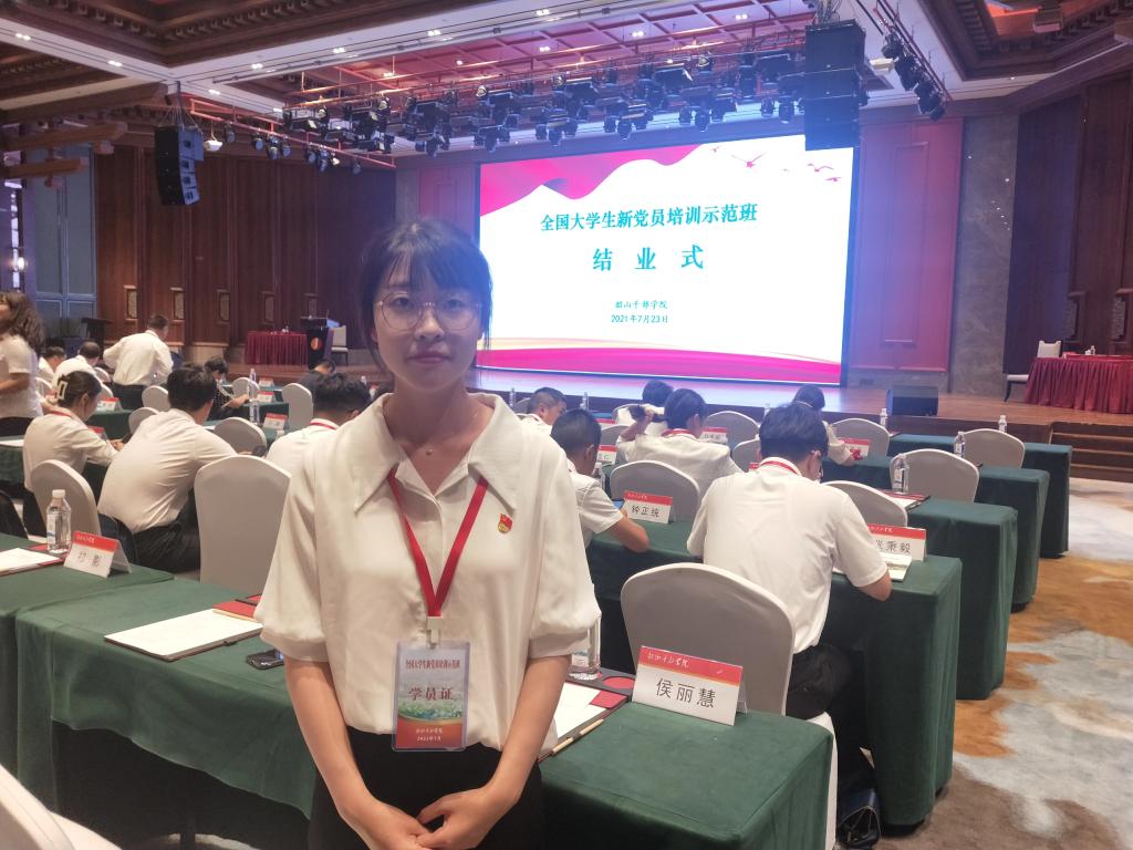 2017级本科生,全国样板支部党员侯丽慧,代表辽宁省属高校大学生新党员(辽宁省仅一名),参加了中央组织部、教育部联合举办的全国大学生新党员培训示范班。本次示范班包含各省(自治区、直辖市)和新疆生产建设兵团党委组织部会同教育部门选调的省属高校(不含部省合建高校)大学生新党员各1人,教育部选调的部分高校大学生新党员94人,各省(自治区、直辖市)和新疆生产建设兵团负责高校党建工作业务部门观摩人员各1人,共159人。