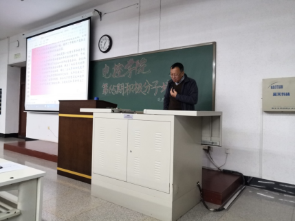 学生第二党支部书记施振雷老师以党组织的培养教育为主题,重点讲述了在入党申请人、积极分子、发展对象、预备党员和正式党员五个阶段党组织进行培养的内容和考核办法。他期望同学们能在培养过程中不断提升个人修养。