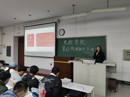 副处级组织员贾鑫老师主讲。她详细地为大家介绍了入党流程,从申请入党、入党积极分子的确定和培训教育、发展对象的确定、预备党员的接收、预备党员的考察和转正五个方面系统讲解了发展党员的程序,对同学们的发展规划提出建议和指导。
