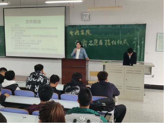 党委副书记张勇志、大学生学习与发展指导中心主任张驰。会上,张驰老师对学霸志愿者的成员组成、服务项目、预约方式等进行了解读,方便各班有学业辅导需求的同学与学霸志愿者们建立联系。