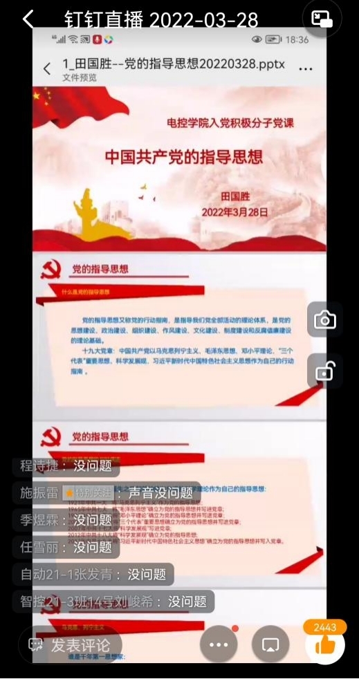 党委书记田国胜老师带领同学们一起生动地学习了中国共产党的指导思想,从什么是党的指导思想、马克思列宁主义、必须推进马克思主义中国化、党的指导思想的与时俱进回答和解决了什么问题、习近平新时代中国特色社会主义思想的“十个明确”等方面进行全方位解读,使同学们端正入党动机,谆谆教导同学们“组织上入党一生一次,思想上入党一生一世”。