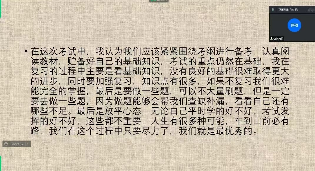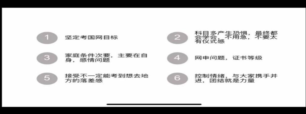 马彤同学通过六点向同学们讲述如何以正确的心态面对国网考试,最重要的一点便是坚定目标,要以平和的心态对待诸多考试科目,结合自身条件选择最佳学习方式,再之要仔细了解网申相关问题以及相关证书要求,还应具有一定的落差接受能力,最后就是调整心态,跟大家一起学习,共同进步。
