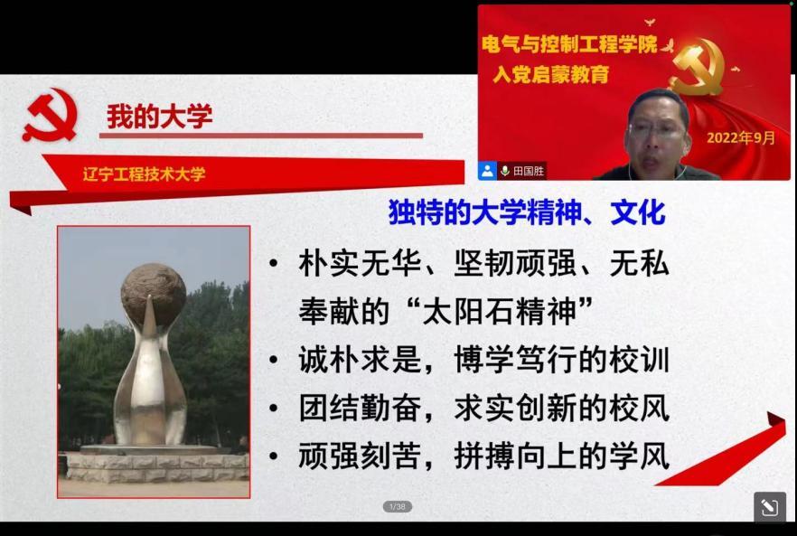党委书记田国胜老师以“端正入党动机”为主题,从“大学意味着什么”着手,介绍了学校的校风校训学风以及“太阳石精神”,告诉大家加入中国共产党应该成为大学生的自觉追求,进而强调端正入党动机的重要性。正确的入党动机不仅要实现在组织上入党,更重要的是实现思想上入党。