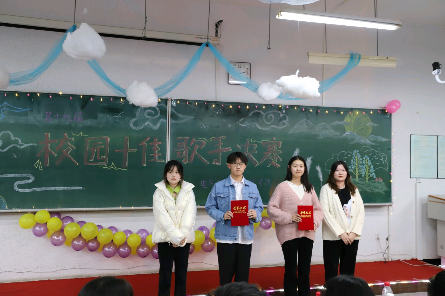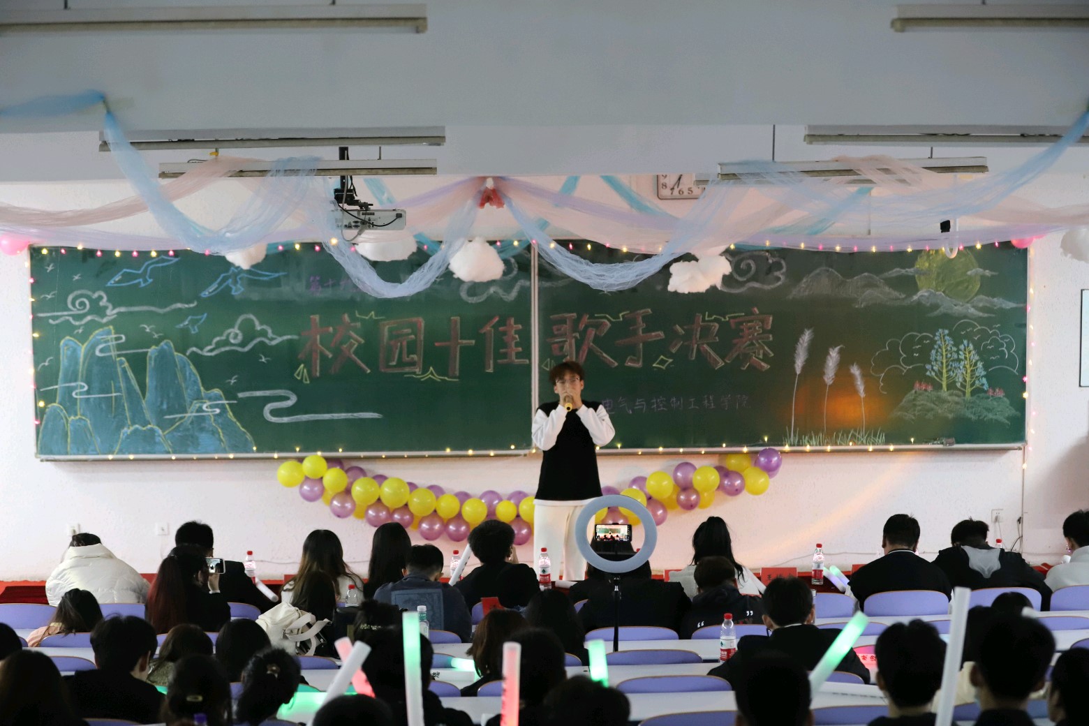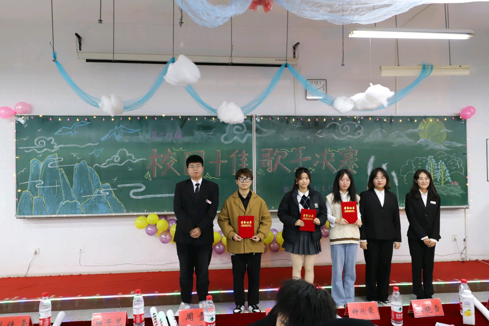 经过激烈角逐与层层选拔,最终有10名选手成功闯入决赛。同学们积极参与,怀揣着激情与梦想,投身歌声的海洋,彰显音乐的魅力。本次大赛分三轮,第一轮:十位选手两两组合与导师进行表演赛。第二轮:抽签形式依次上场表演,取前六名进入第三轮,未晋级的四位选手获得优秀奖。第三轮:由第二轮分数由低到高依次上场表演,最终一等奖一名,二等奖两名,三等奖三名。为了烘托气氛,比赛请到了往届选手进行激情演唱,为观众带来了一场听觉盛宴,本次大赛进行了现场直播,让线上的观众大饱眼福,使整个活动更具有趣味性,提高了活动的参与感以及音乐的认同感。在美妙悠扬的歌声中,紧张刺激角逐的同时不乏妙趣横生。比赛过程中,选手们享受其中,尽情的展现自己的才艺,创造出一幅幅声色兼美的靓丽风景,同时歌曲中饱含的情感也感染了在座观众,掌声和喝彩声经久不息,打call声此起彼伏,营造了现场浓郁的艺术氛围,让人沉浸其中,流连忘返。