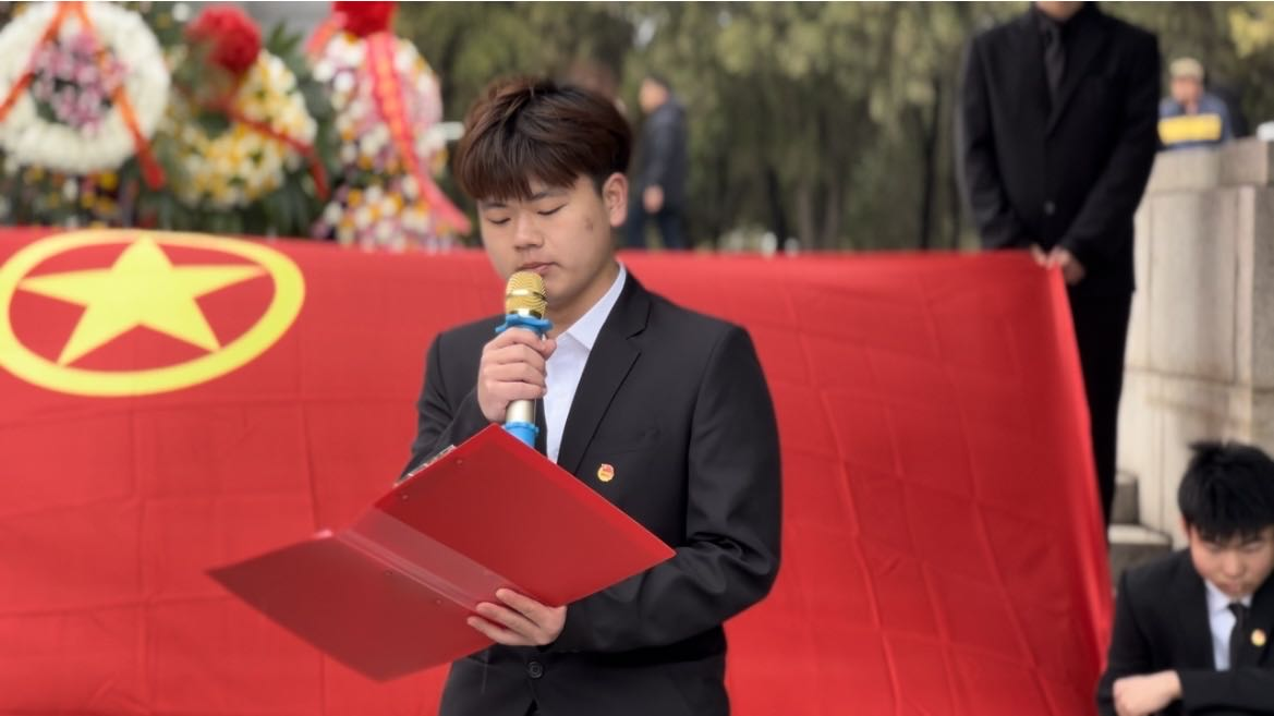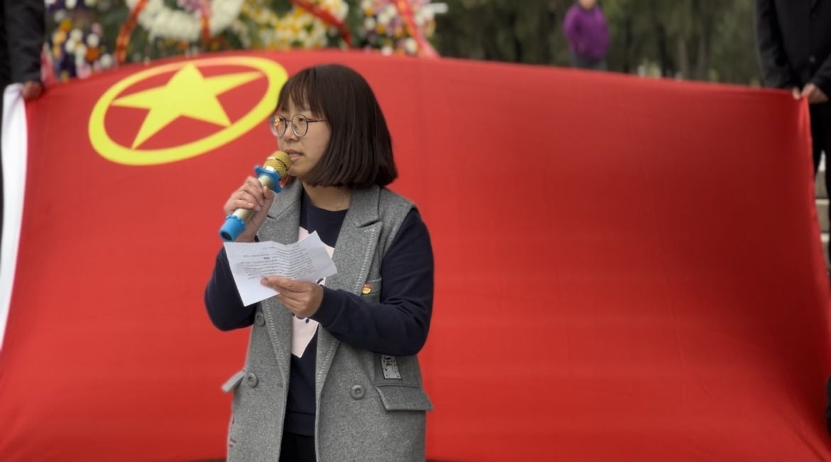 优秀团员代表张天阔同学,用生动的语言向大家讲述了发生在塔山阻击战的一个故事,他在烈士纪念碑前动情的说道:“是你们将中华民族从生死存亡的边缘拯救回来,是你们用自己的血肉之躯建设了新中国。作为新时代的青年,我们将肩负历史使命,坚定前进信心,努力成为堪当民族复兴重任的时代新人,让青春在为祖国、为民族、为人民、为人类的不懈奋斗中绽放绚丽之花!”