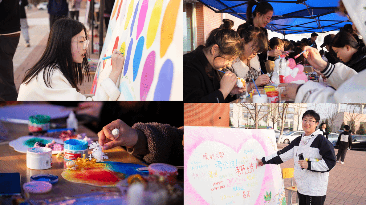 本次活动由“向阳而生”“小熊抱抱”“绘梦溢彩”“请留下你的笑脸”“花样气球”“爱心祝福”六个心理活动板块组成。活动现场热闹非凡,学生们纷纷驻足参与,他们在白板上、纸扇上写下对自己的鼓励、愿望以及生活中的小幸福。
