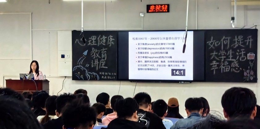 邀请校心理中心老师为同学们举办了一场题为“如何提升大学生活幸福感”专题讲座。内容覆盖了心理健康的基础知识、学生常见心理问题的识别与应对策略,以及有效的情绪管理和压力缓解技巧。