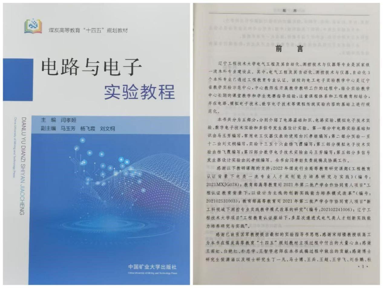 (通讯员 刘文桐)2024年5月,电工电子实验教学中心自编煤炭高等教育“十四五”规划教材——《电路与电子实验教程》正式出版发行。教材由副院长闫孝姮主编,实验中心主任马玉芳,教师杨飞霞,刘文桐副主编。新教材的出版发行有着继往开来的重要意义,标志着U体育官网