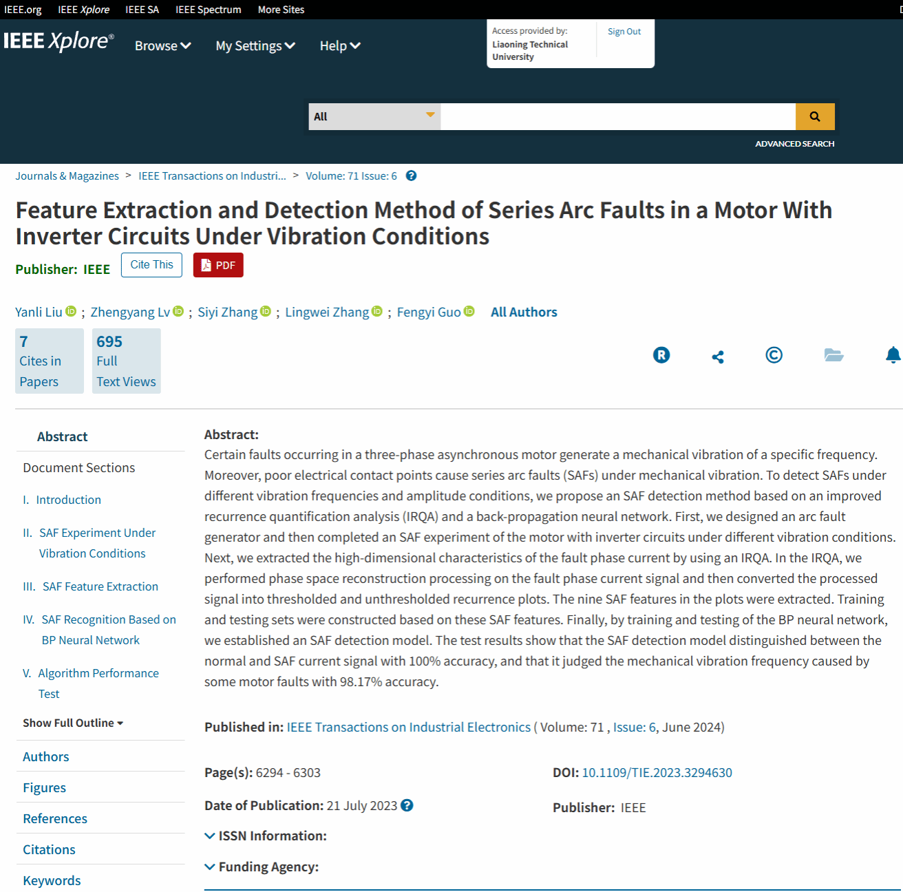 刘艳丽教授与其研究生吕正阳合作,在中科院一区TOP期刊《IEEE Transactions on Industrial Electronics》(简称《TIE》)上发表了论文《Feature Extraction and Detection Method of Series Arc Faults in a Motor With Inverter Circuits Under Vibration Conditions》。