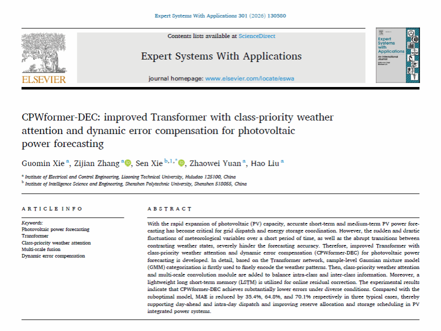 谢国民教授与研究生张子健合作,在中科院一区TOP期刊《Expert Systems With Applications》(简称《ESWA》)上发表了论文《CPWformer-DEC: improved Transformer with class-priority weather attention and dynamic error compensation for photovoltaic power forecasting》。