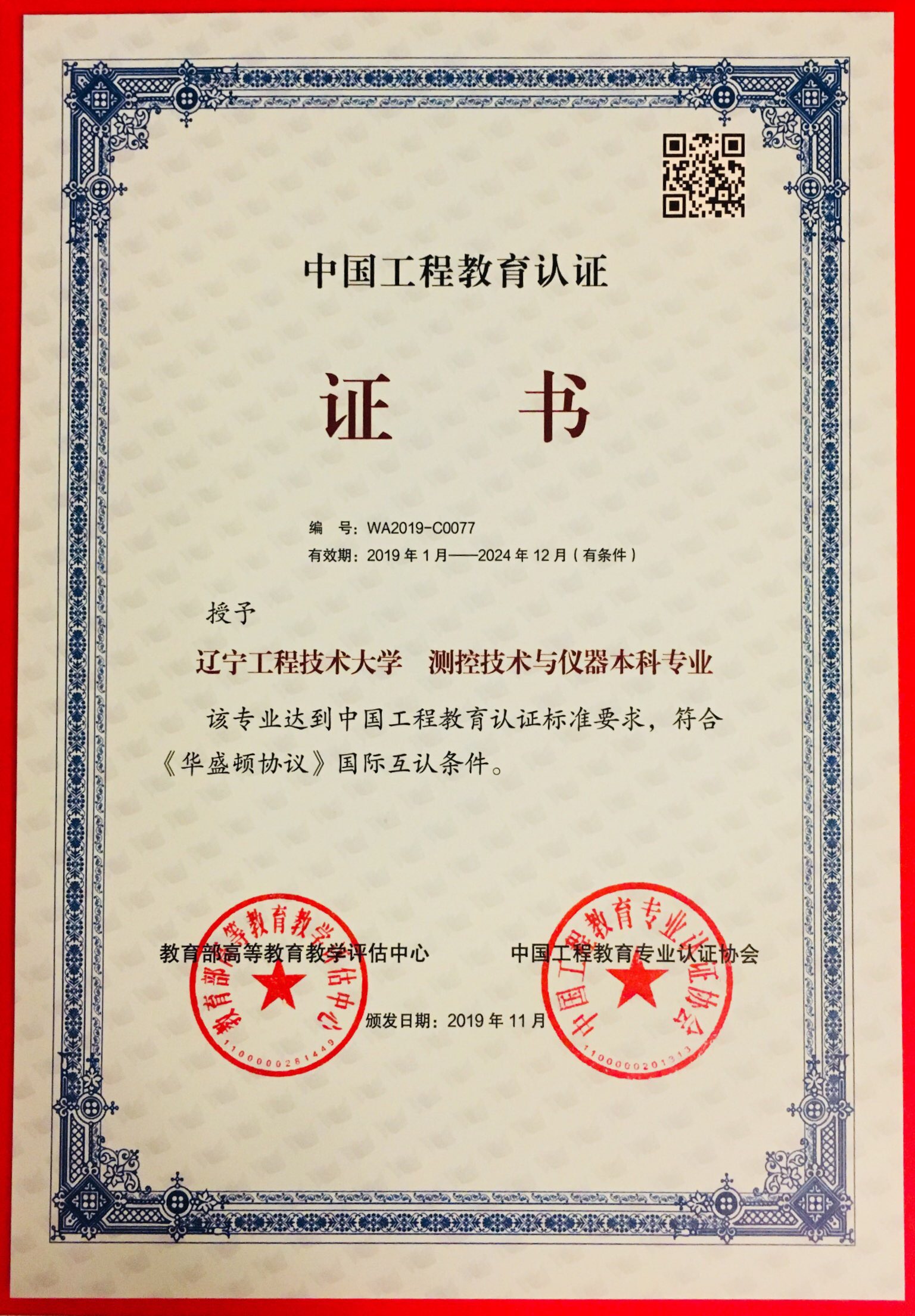 测控技术与仪器专业工程教育认证证书