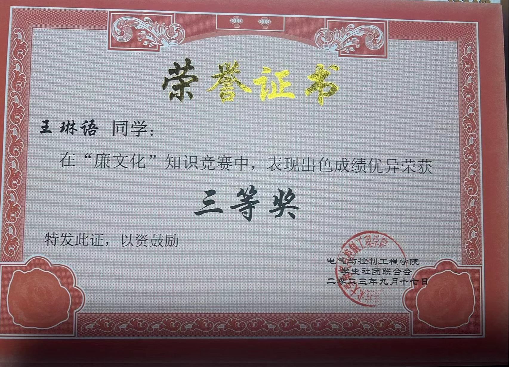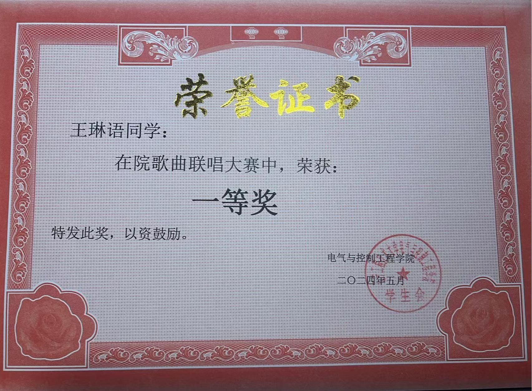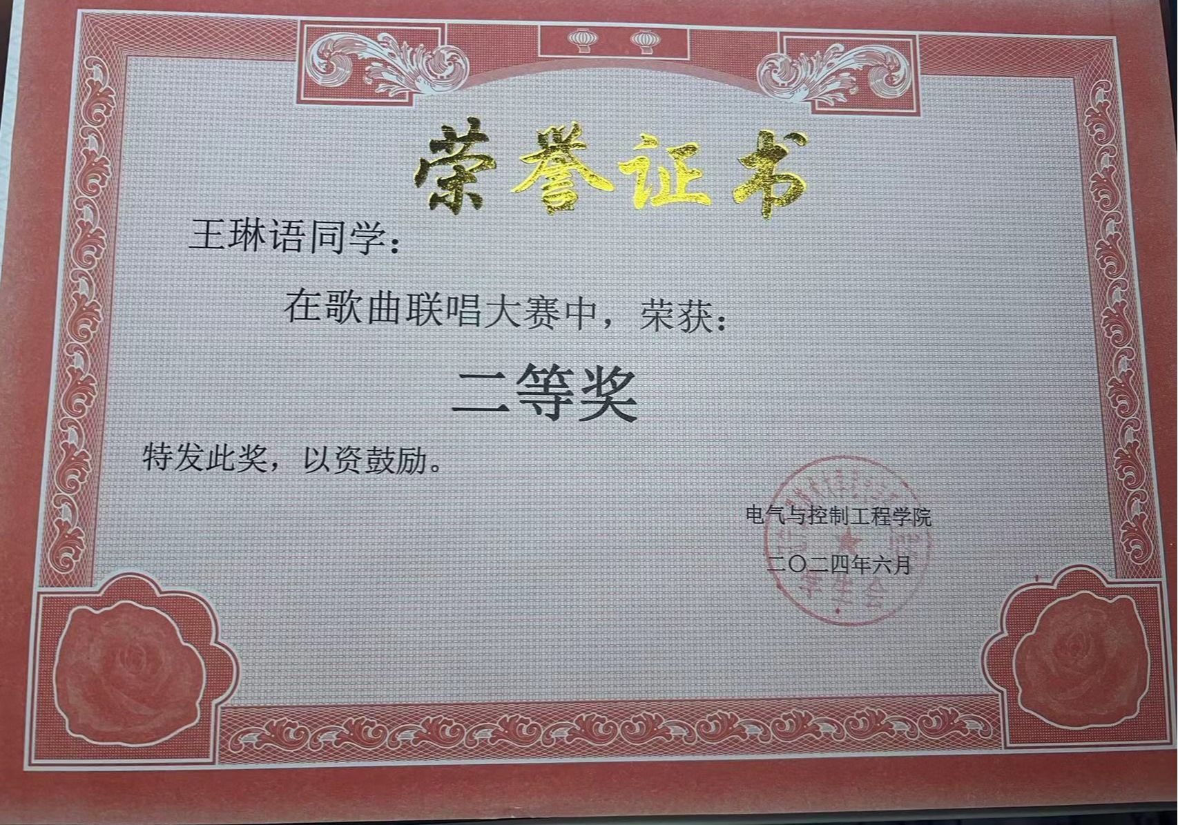 社会实践类:2023年“廉文化”知识竞赛三等奖、2024年校歌曲联赛二等奖、2024年校歌曲联赛二等奖。