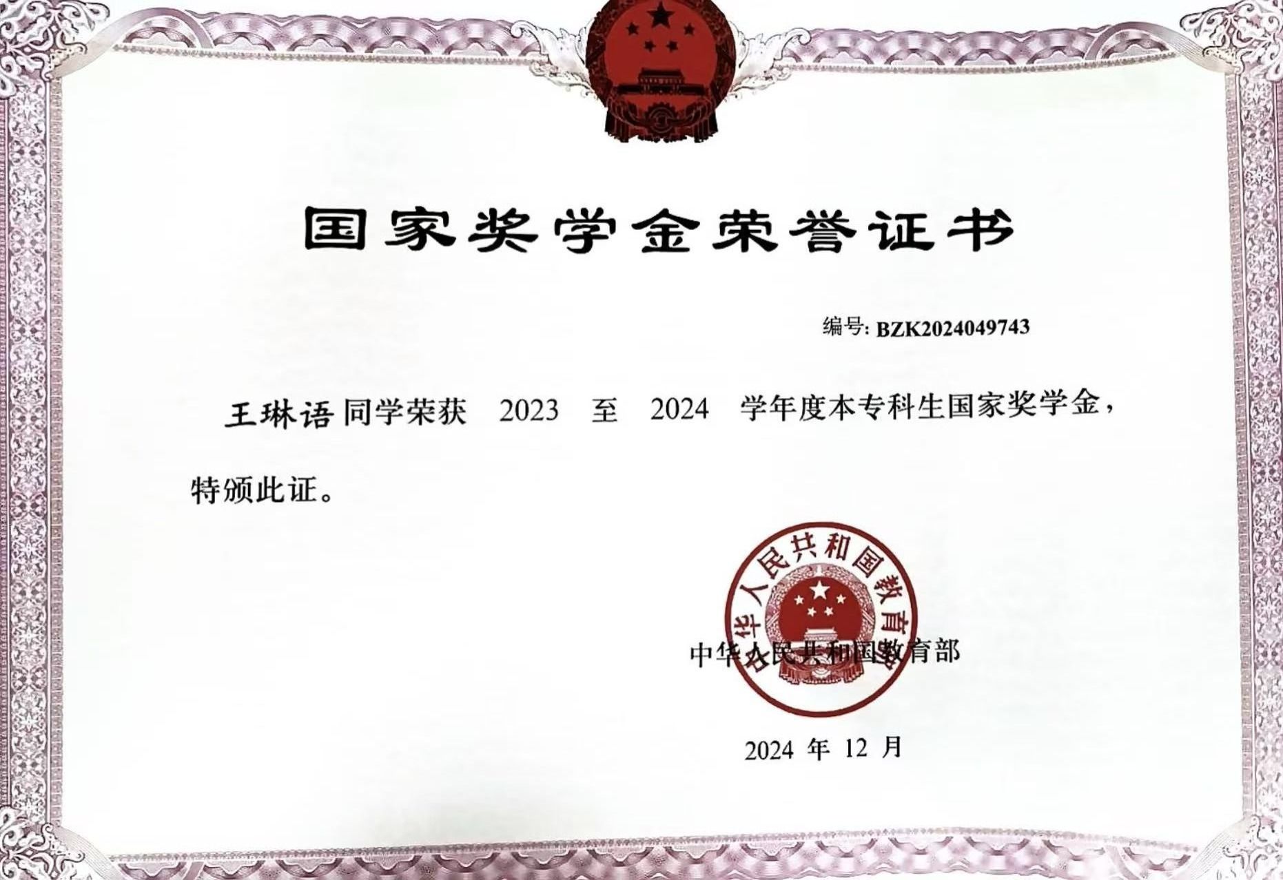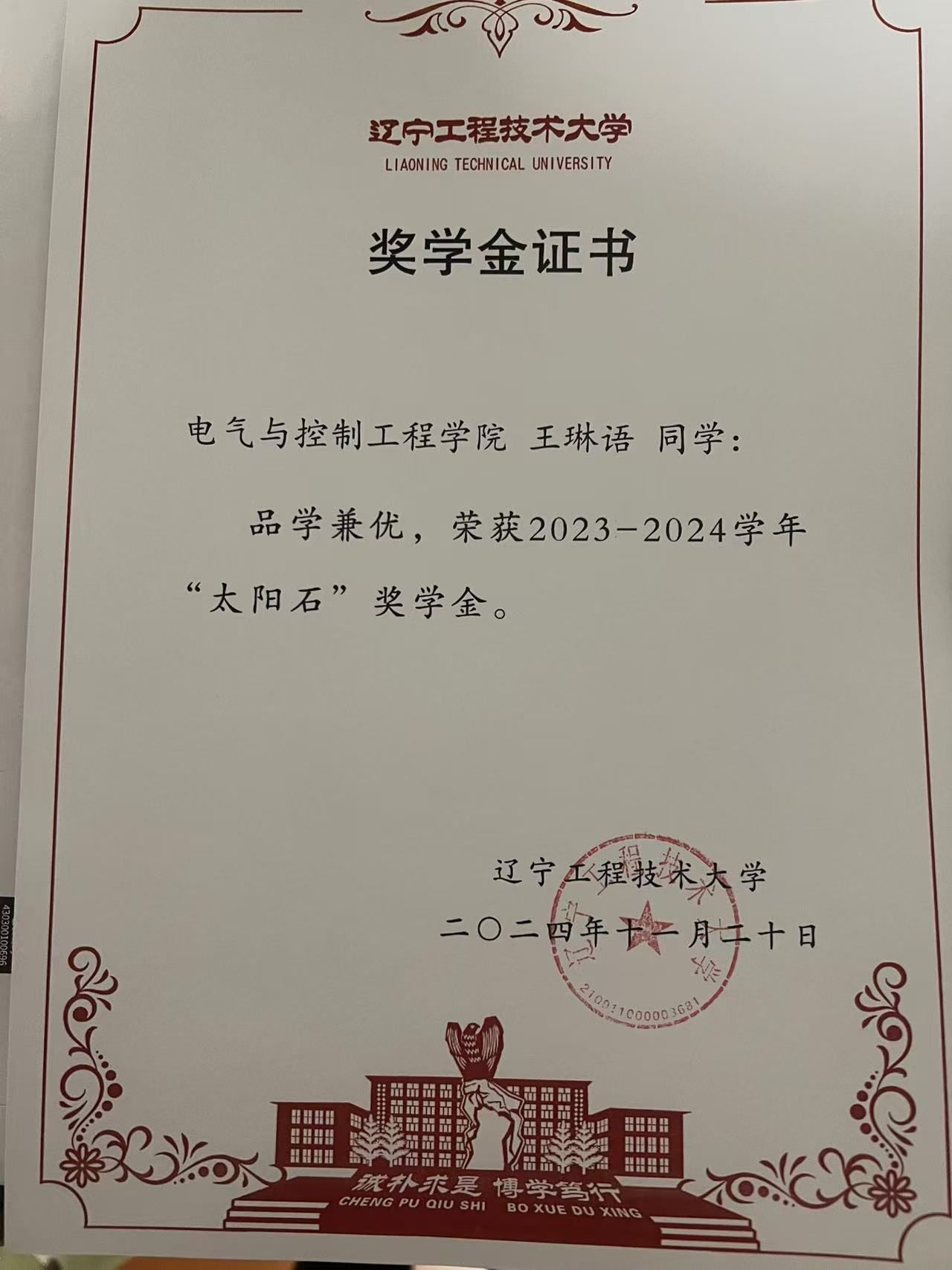 奖学金类:累计获得国家奖学金1项、校级奖学金2项。