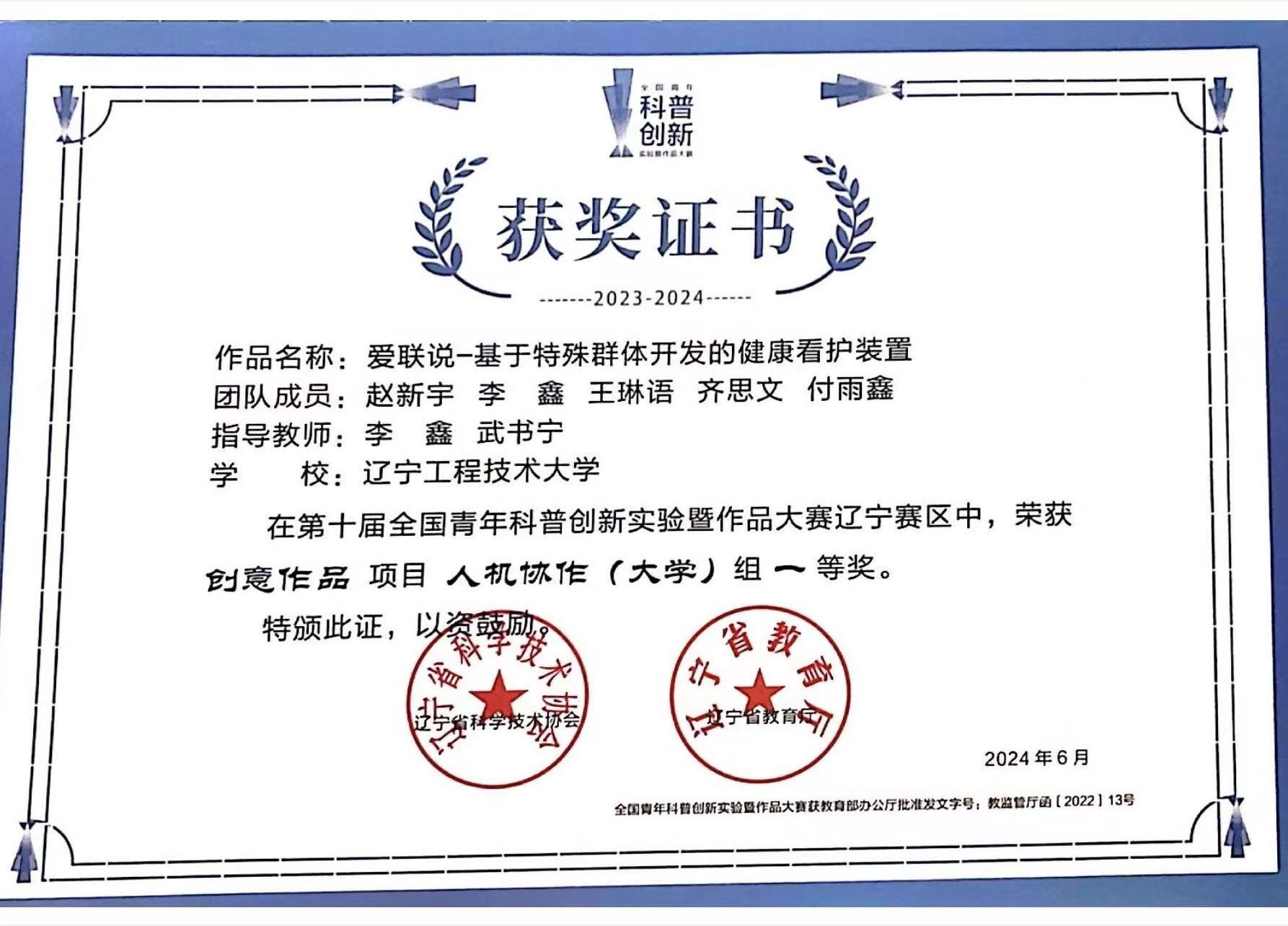 2 全国青年科普创新实验暨作品大赛 奖项:省级一等奖 指导教师:李鑫、武书宁