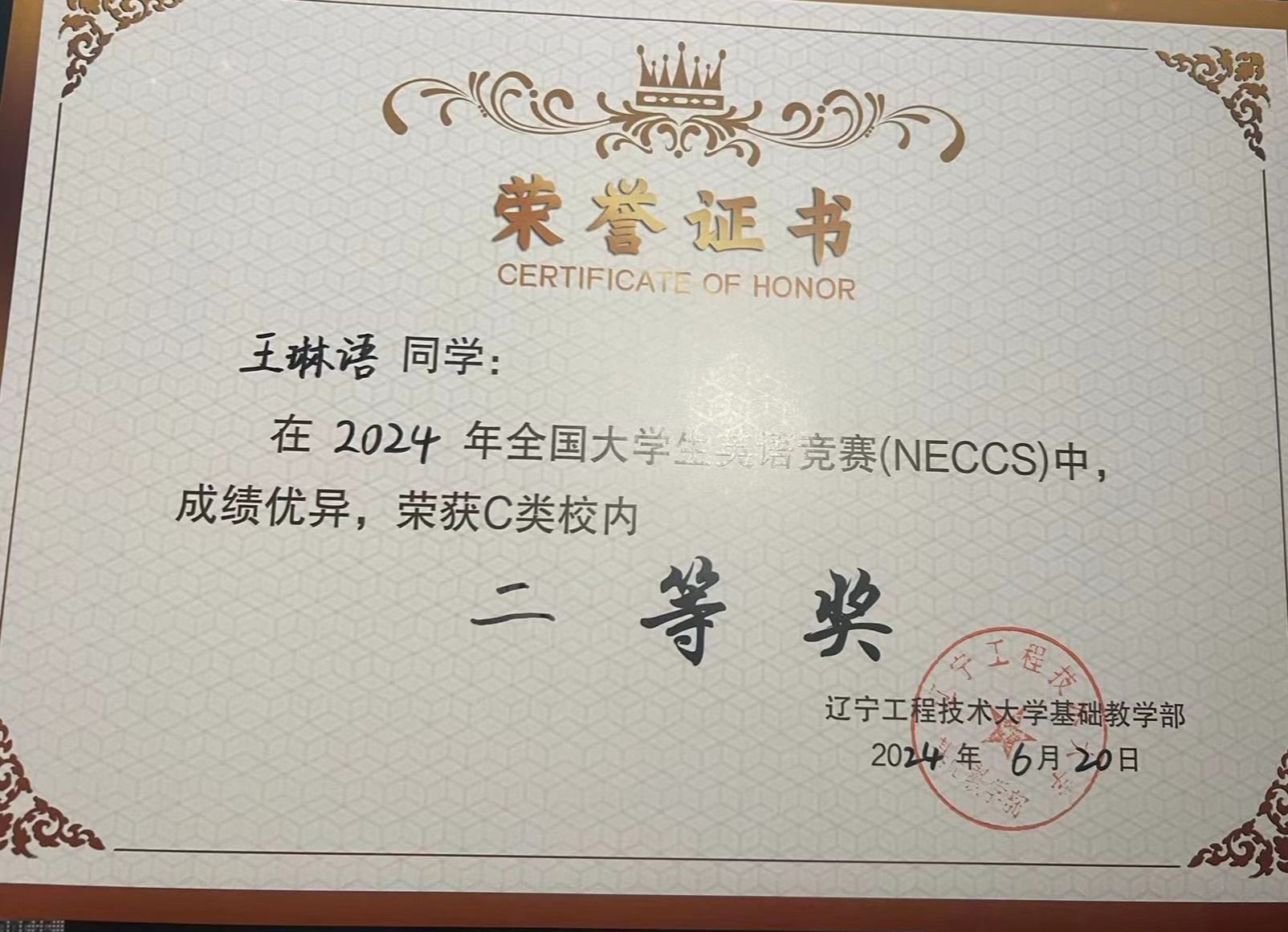 12 2024年全国大学生英语竞赛(NECCS) 奖项:校级二等奖