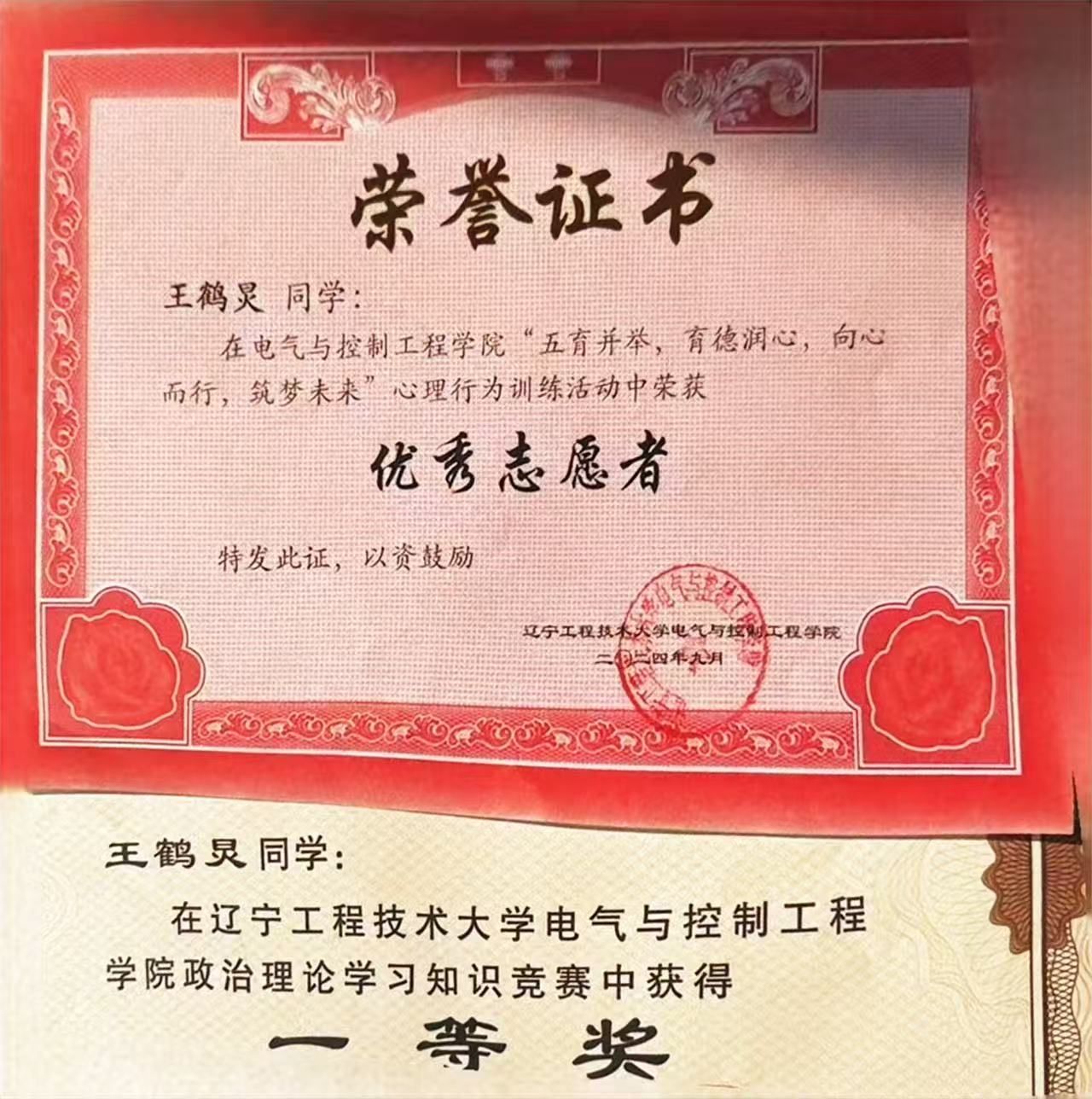 其他类:连续两年三好学生、校优秀志愿者荣誉称号