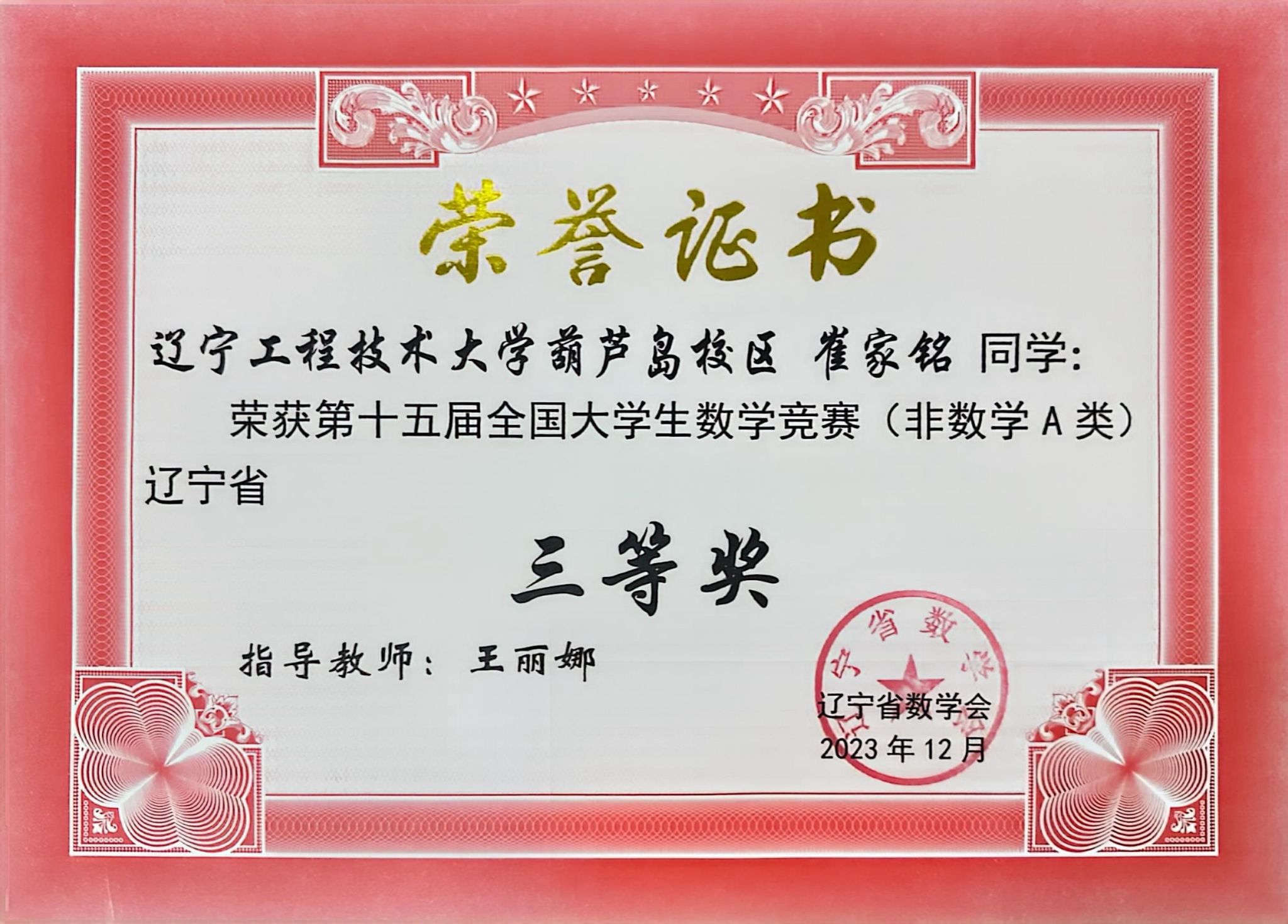 3 第十五届全国大学生数学竞赛(非数A类)奖项:辽宁省三等奖 指导教师:王丽娜